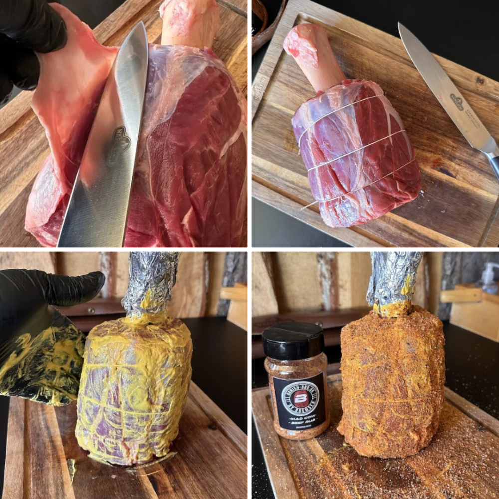 Smør hele kødet i et jævnt lag sennep, og krydr derefter med Mad Cow Beef Rub over det hele.