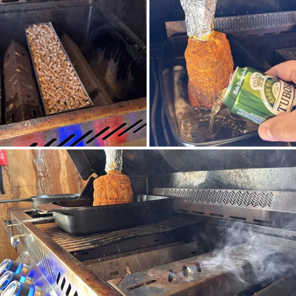 Når grillen holder 140°C, sætter du et ildfast fad i den kolde zone og placerer beef hammeren i fadet.