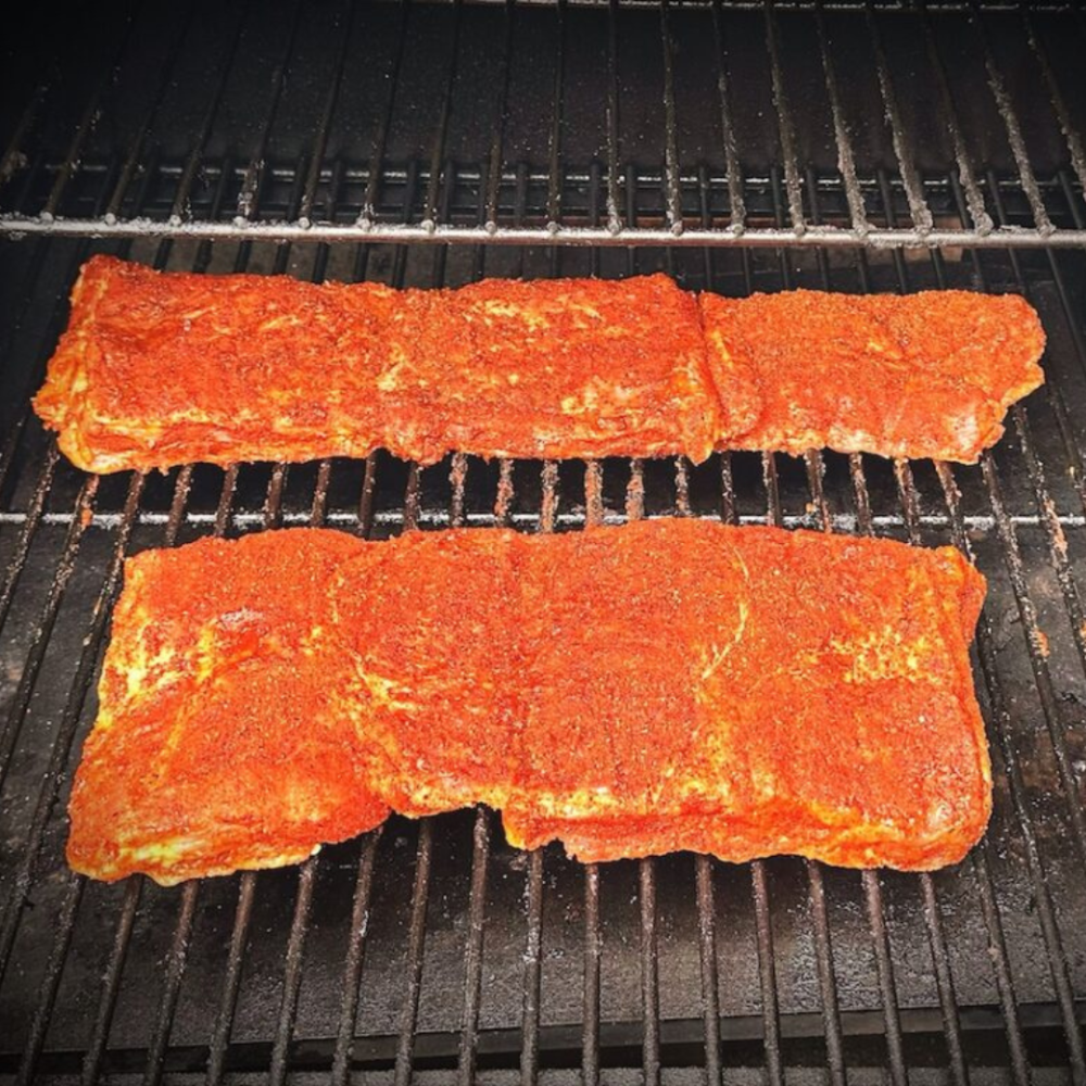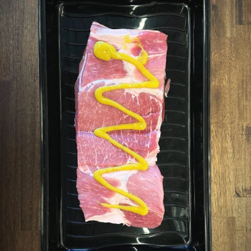 Trim flapperne, så de får den klassiske Spareribs-form. Smør dem derefter med sød sennep, og drys et generøst lag Magic Dust BBQ Rub over hele overfladen. Nu er kødet klar til grillen.