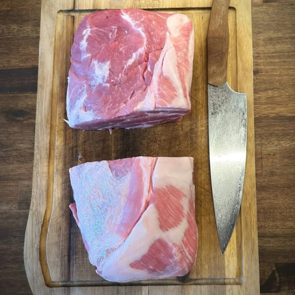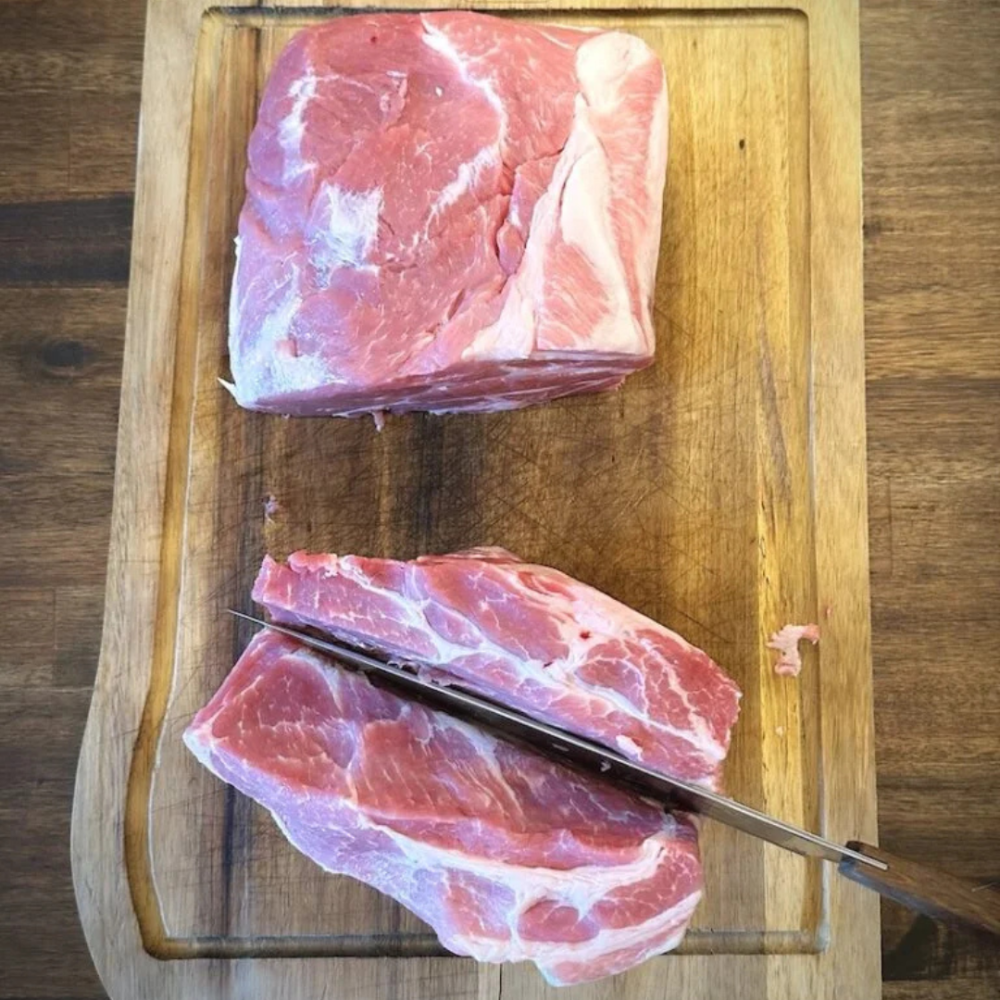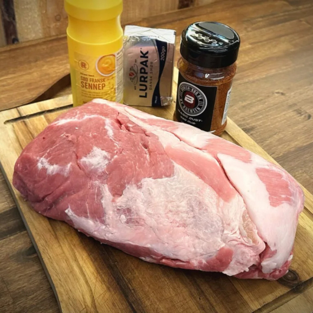 • Ca. 2 kg nakkesteg: Del den på den korte side, stil den på højkant, og skær forsigtigt midt i kødet næsten hele vejen ned, så du kan åbne stykket som et “klap-op”.