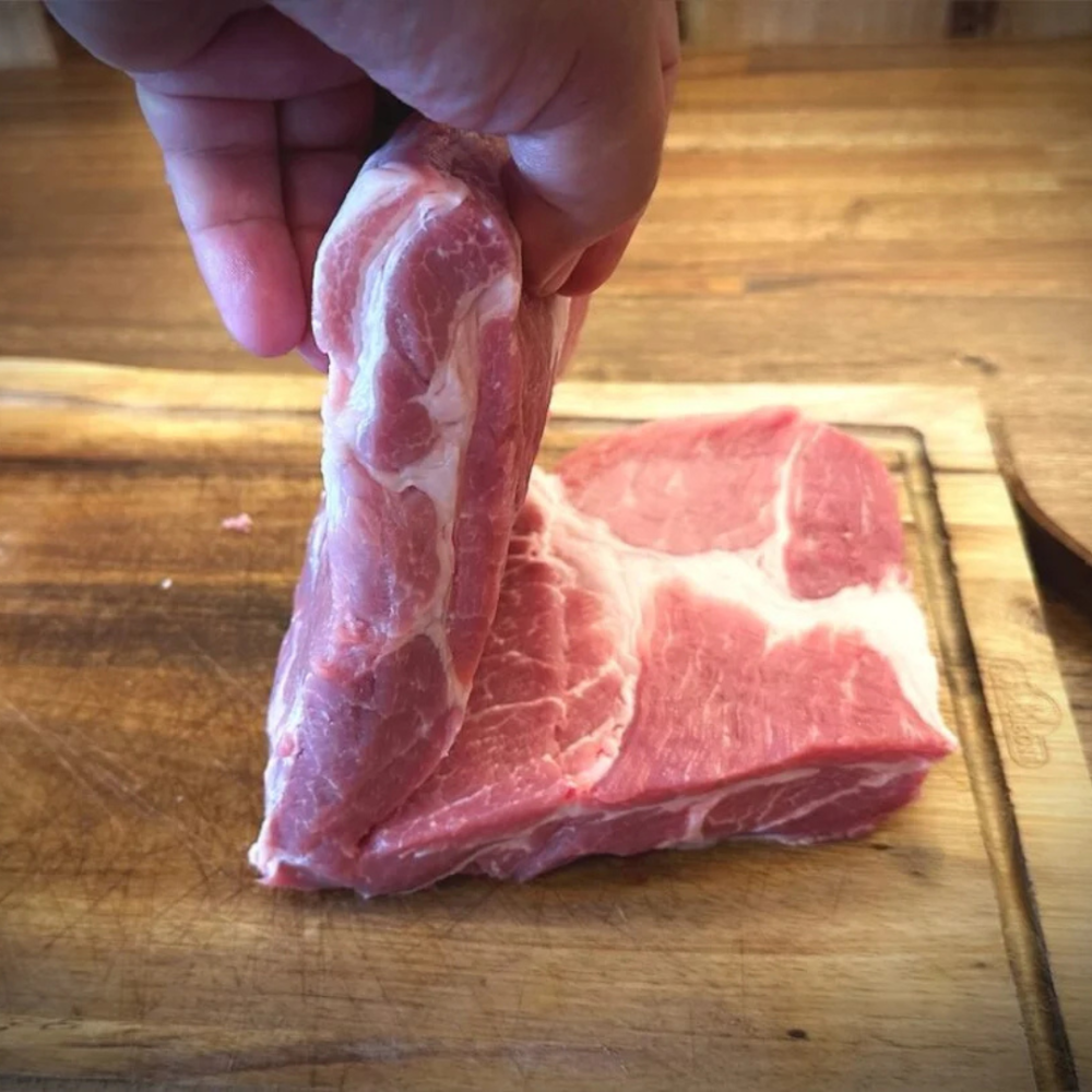 Start med at skylle din nakkefilet eller nakkesteg efter udpakning, og lad den ligge et par minutter på spækbrættet, så den lige kan komme til “temperatur” i køkkenet.