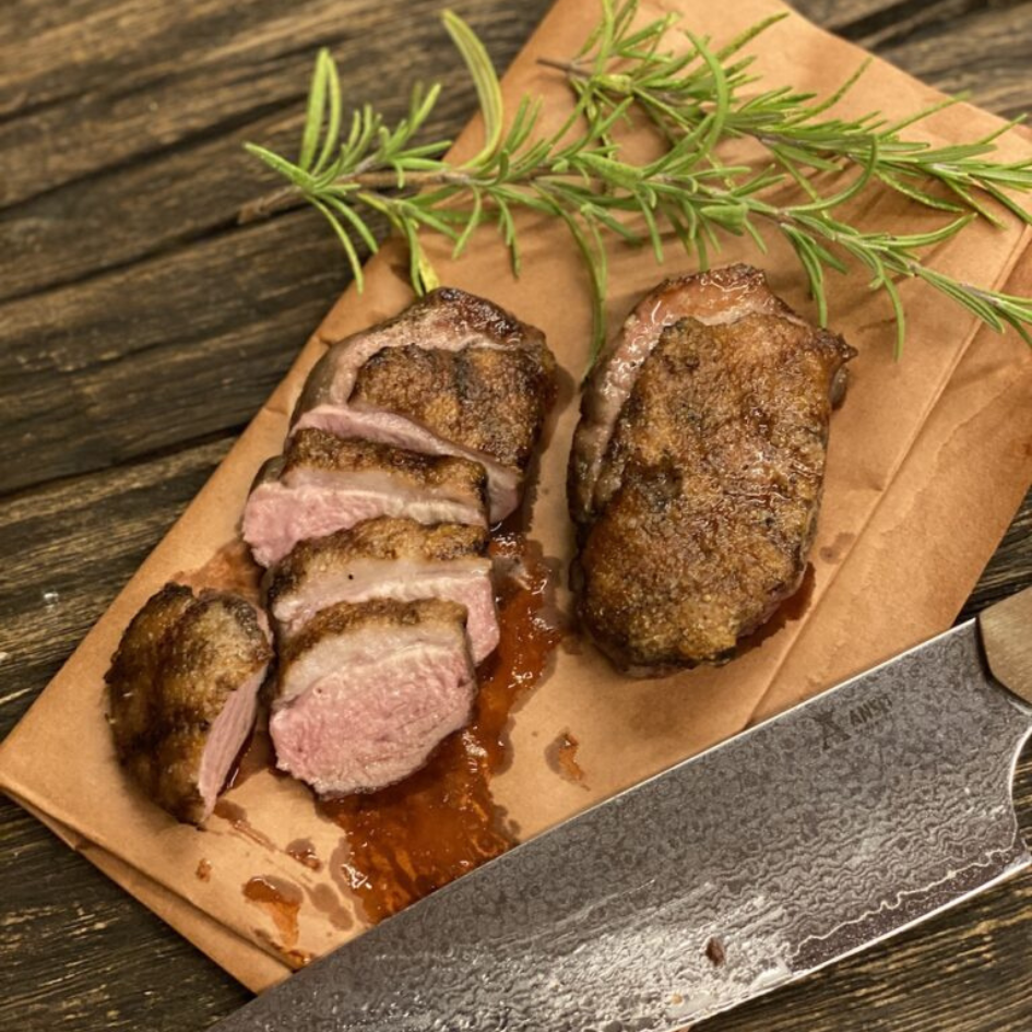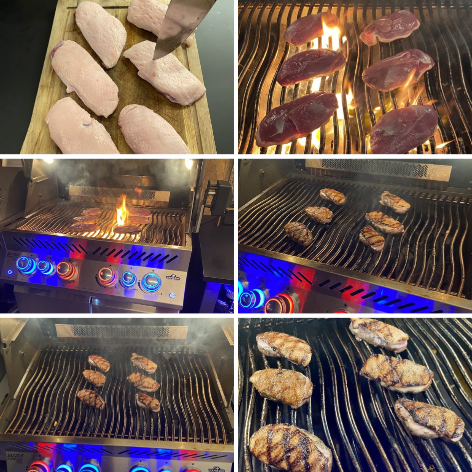 • Læg andebrysterne på direkte varme med skindsiden nedad i 2–3 minutter. Flyt dem rundt løbende for at undgå opflamninger.
