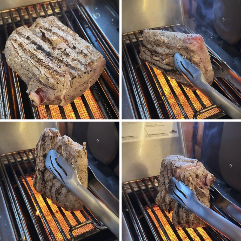 Når grillen er klar, bruner du ribeyen af på alle sider, cirka 1 minut pr. side.