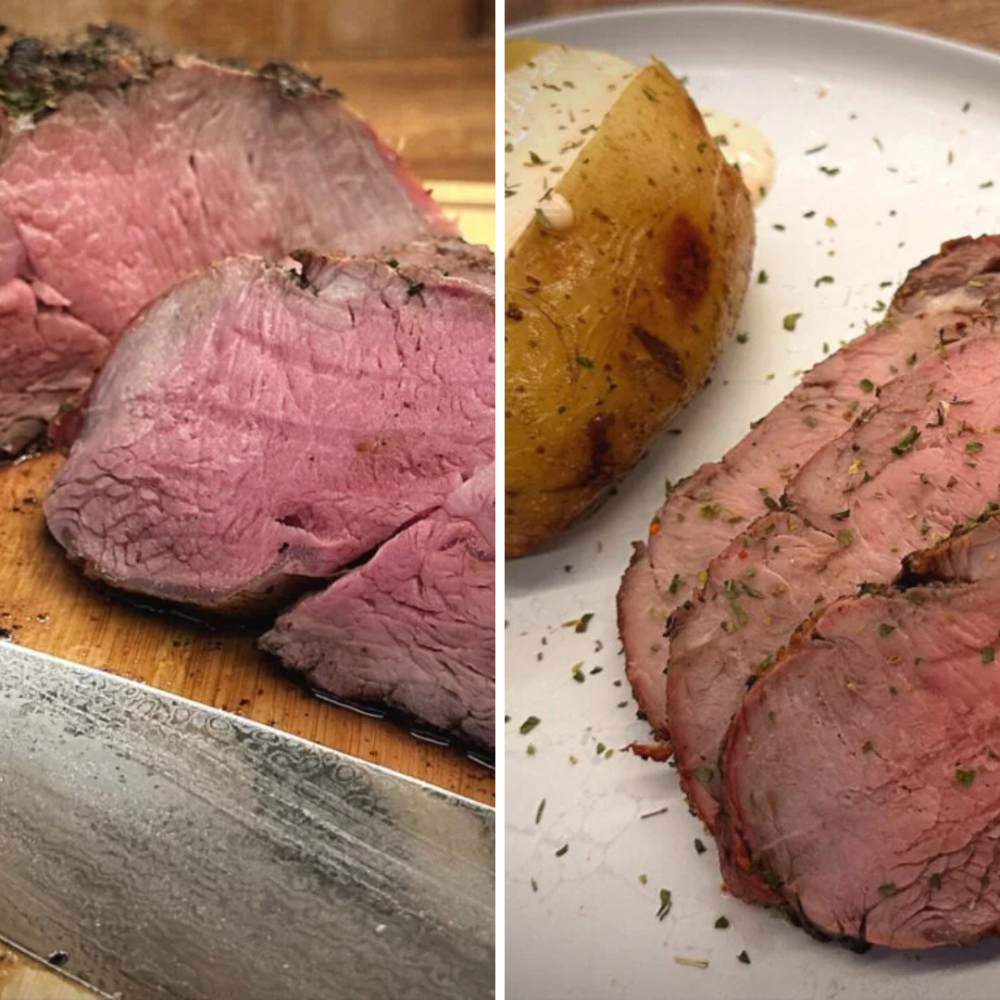 Sæt et stegetermometer (fx Meater 2 Plus*) i kødet, og grill til kernetemperaturen rammer 60°C for en rosa midte.