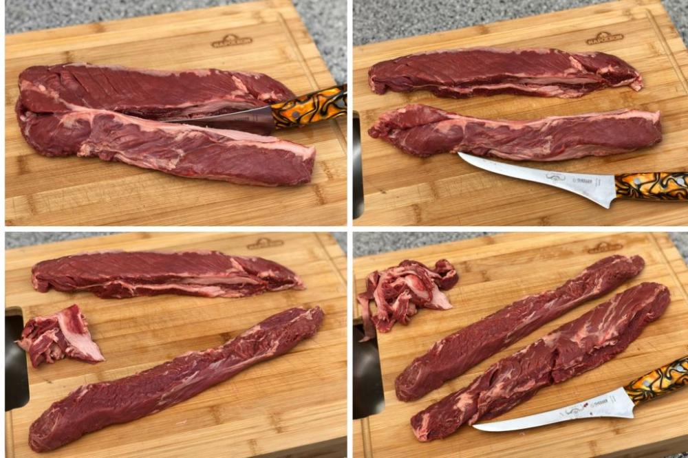 Skyl nyretapperne efter udpakning, og lad dem ligge et par minutter på spækbrættet, så de får stuetemperatur. Trim derefter kødet for overskydende fedt og sener. Brug en skarp kniv til at skære langs midtersenen og fjerne bindevævet – det gør en stor forskel for mørheden.