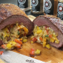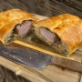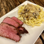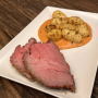 Rødvinsmarineret oksemørbrad med hasselbackkartofler og svampesauce.