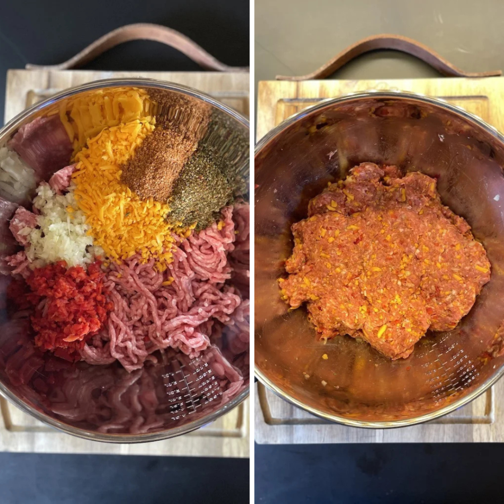 Kom farsen i en skål og tilsæt peber, løg, cheddar, 1 spsk Pig Powder og 1 spsk Greek Style.
