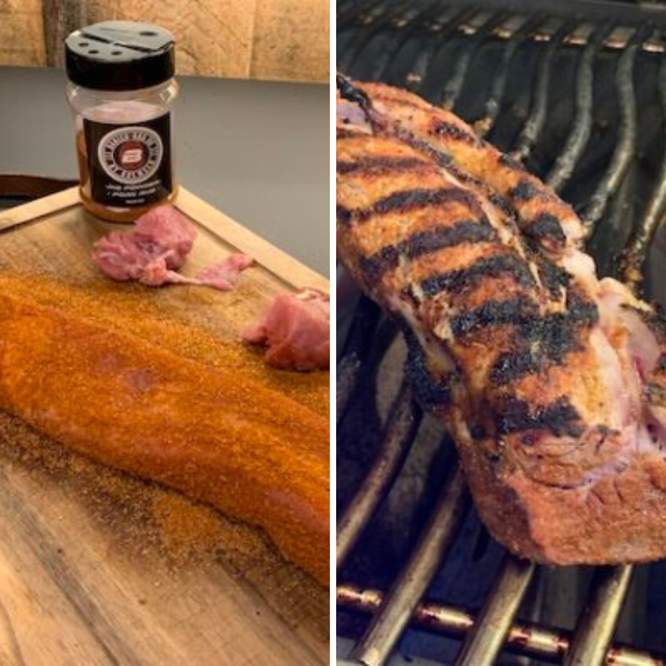 Trim enderne af svinefileten og krydr hele fileten med Pig Powder eller anden rub.
